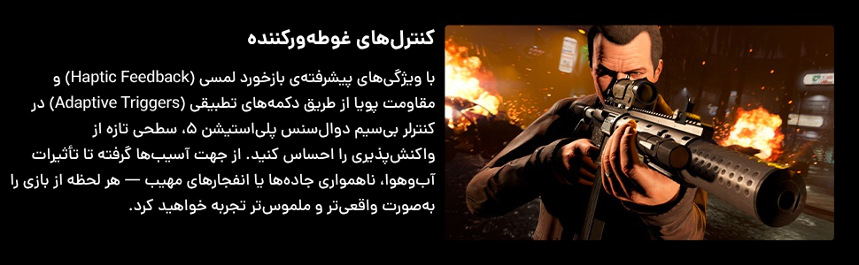 🎮 بازخورد حسی و تریگرهای تطبیقی (HAPTIC FEEDBACK & ADAPTIVE TRIGGERS): احساس واقعی در کنترلر DualSense؛ از ضرب گلوله تا لرزش جاده و انفجارها.