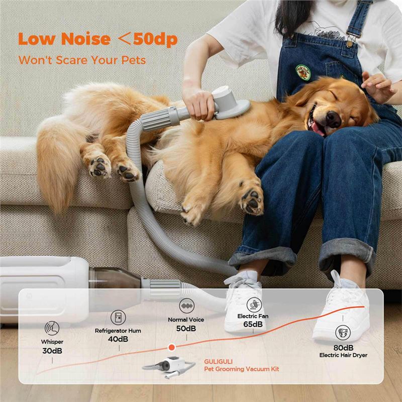 این محصول حیوانات خانگی را نمیترساند! صدای جاروبرقی آن کمتر از ۵۰ دسیبل است. ۵ سطح مکش قابل تنظیم کیت وکیوم نظافت حیوانات خانگی GULIGULI SHARK باعث میشود تا حیوان خانگی شما احساس آرامش کند و در حین آرایش نترسد.